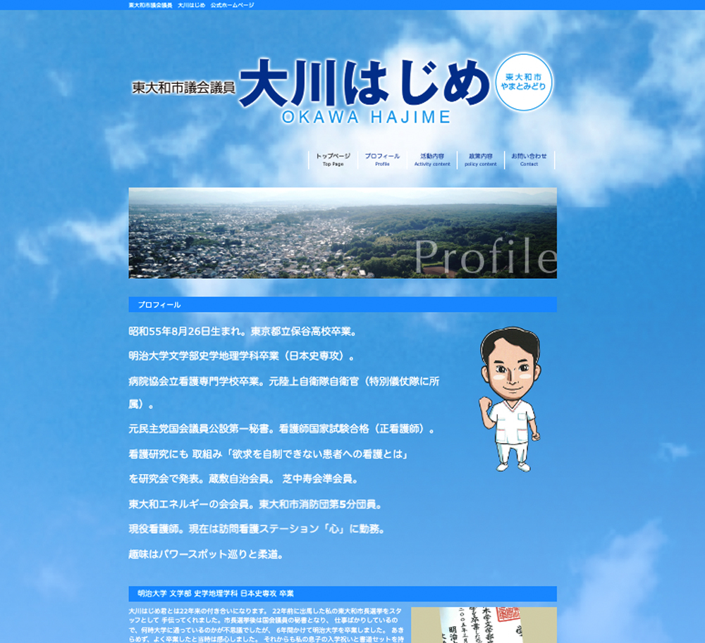 市議選の準備としてご依頼いただき、日々の活動報告やプロフィールなど、地元の有権者へのメッセージやご報告を目的としたサイトです。